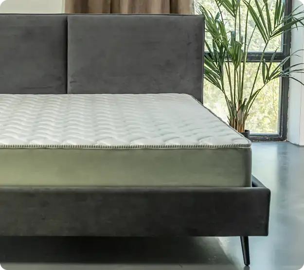 Просвет над полом в 150 мм обеспечивает достаточное пространство для уборки, включая использование робота-пылесоса. Заглубление матраса на 50 мм и высота по краю царги 335 мм делают кровать удобной и практичной. Все соединения кровати выполнены с использованием болтов, что гарантирует прочность и надёжность конструкции. Обратная сторона изголовья изготовлена из прочной и долговечной технической ткани, обеспечивая дополнительную износостойкость.