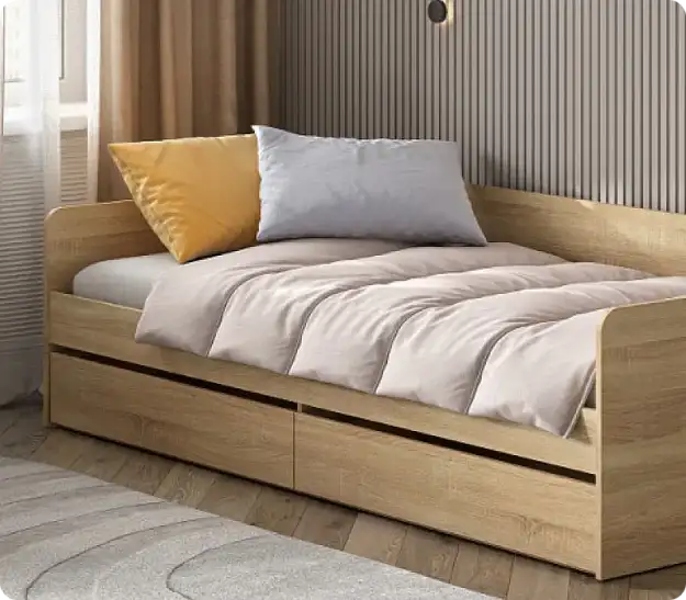 Спальное место размером 900x2000 мм обеспечивает достаточно пространства для комфортного сна. Настил под матрас также выполнен из ЛДСП 22 мм, что позволяет выдерживать вес свыше 100 кг распределённой нагрузки. Это делает кровать идеальным выбором для тех, кто ценит прочность и устойчивость. Выдвижные ящики на шариковых направляющих не только добавляют функциональности, но и обеспечивают долговечность использования.